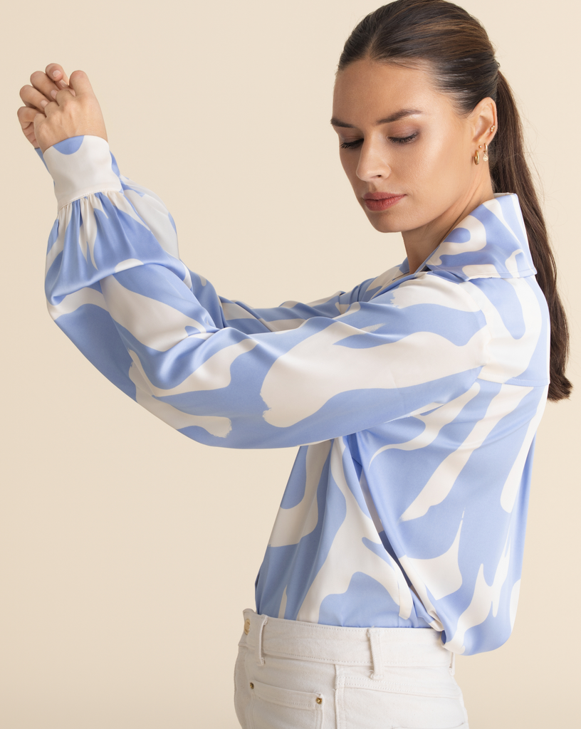 With its new bubble-look cuff and a contrasting inner collar, this shirt is all about the details. The elongated cuffs, big collar, and concealed button stand give it that signature Classic Elle edge, while the slightly lower back ensures a flattering fit.