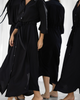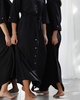 A Soft satin-feel blend (98% polyester, 2% spandex), this dress drapes beautifully, featuring a v-neckline, a flattering drawstring waist, and delicate mother-of-pearl buttons for a touch of elegance.