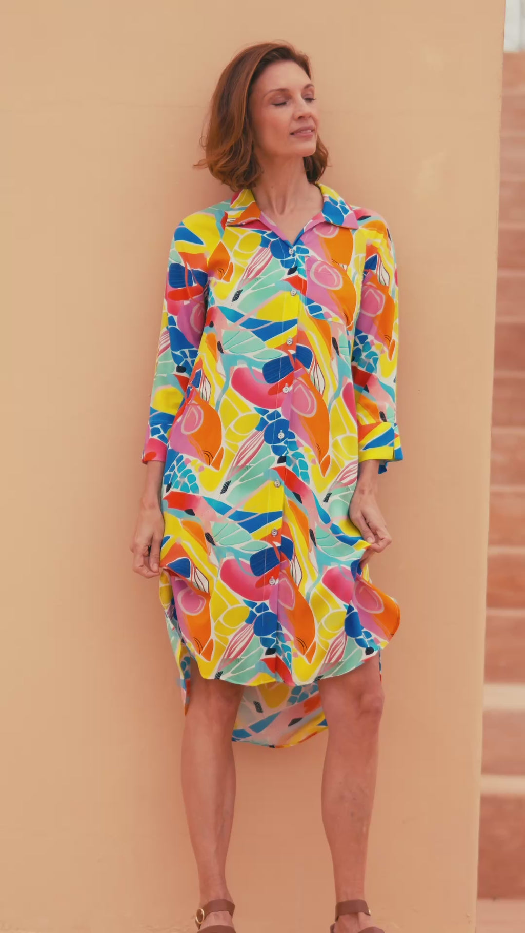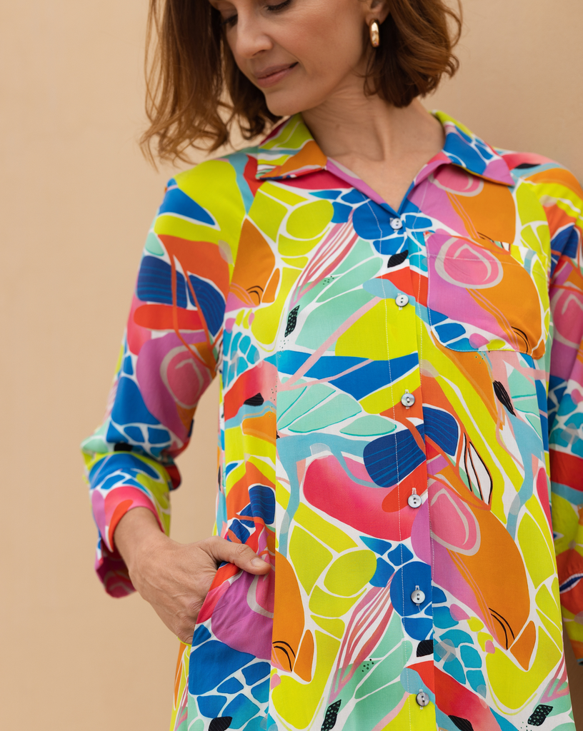 Available in vibrant prints. With medium-length sleeves that can be rolled up and tied up.