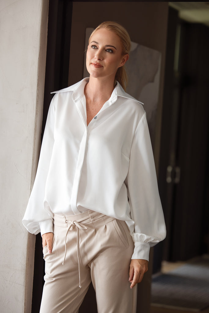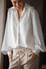 A softly structured collar and feminine V-neck opening create a clean, elegant neckline, while the long sleeves are finished with gentle volume and refined cuffs for a subtle touch of sophistication. Breathable and lightweight, this shirt is perfect for warm days and ideal for layering as the seasons change.