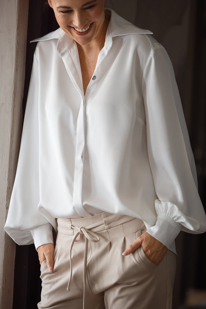 The Classic Elle Shirt is made from ultra-light sily giorgo satin, offering a beautifully soft, airy feel with an effortless drape. Designed to be both timeless and versatile, it features a relaxed yet flattering style that moves easily with the body.